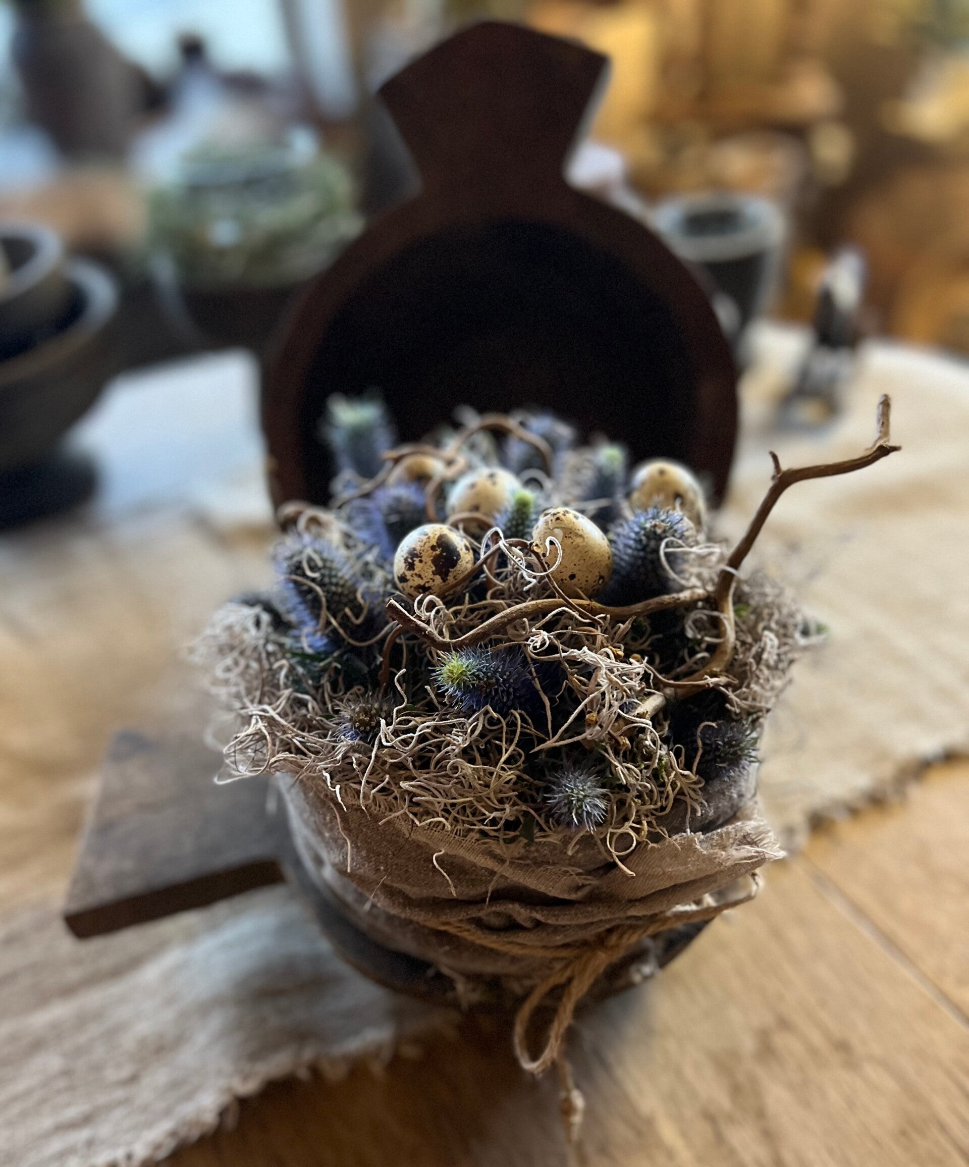 Nestje met paaseitjes, vers groen en afgewerkt met shabby linnen.