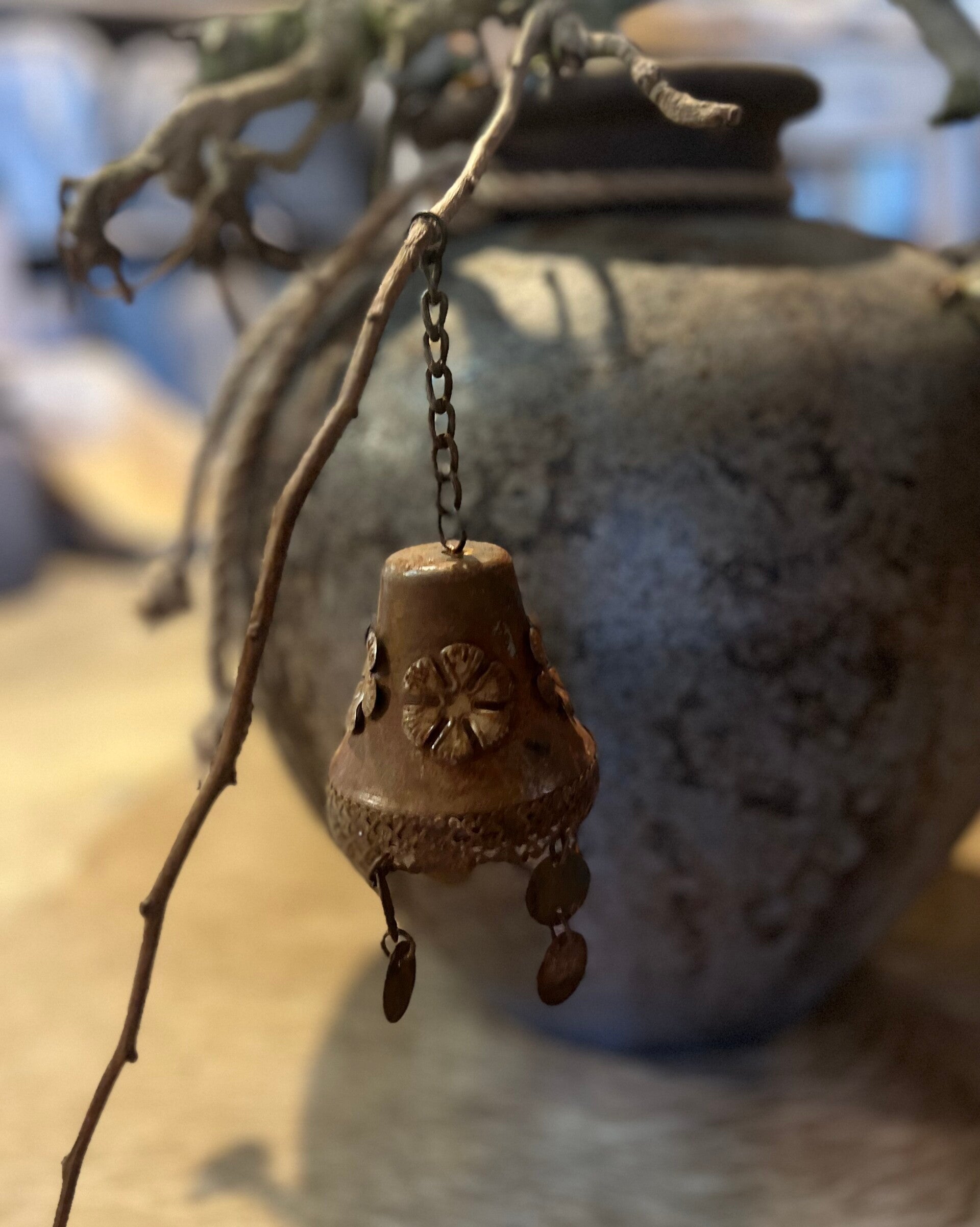 De bel heeft een verweerde, rustieke afwerking en is gedetailleerd met bloemen en kleine hangende muntjes.