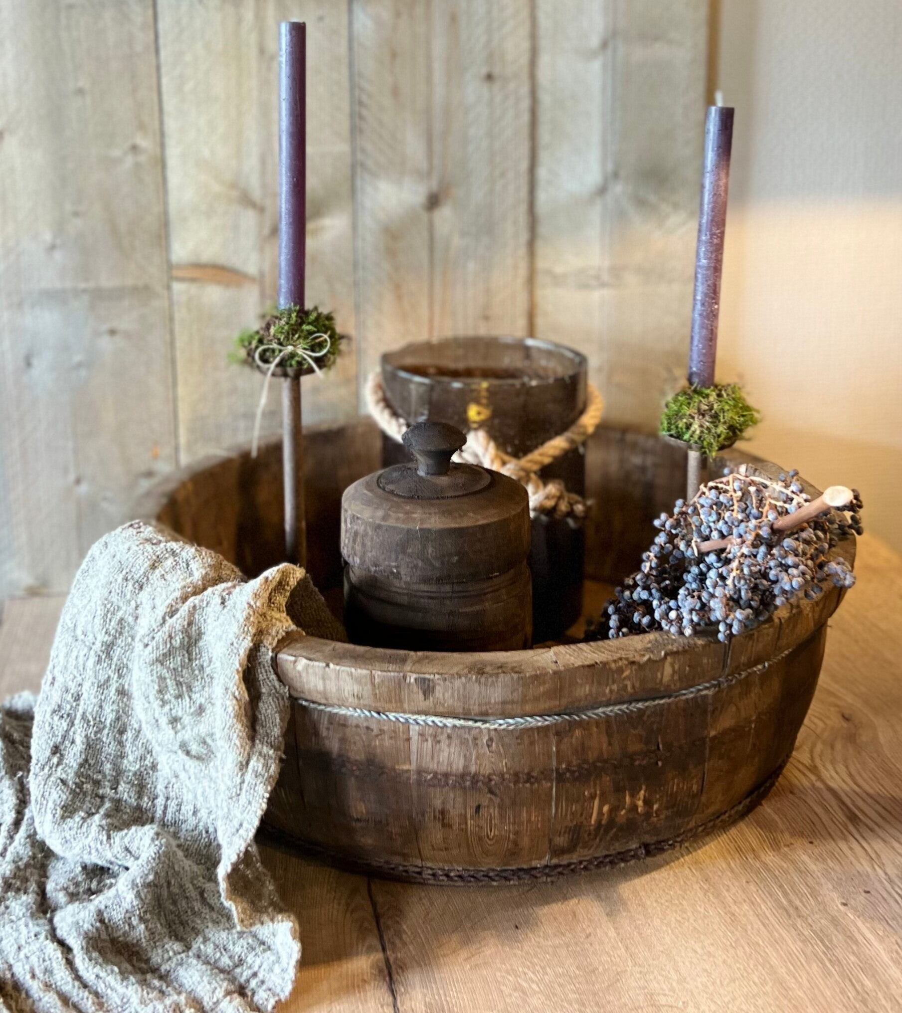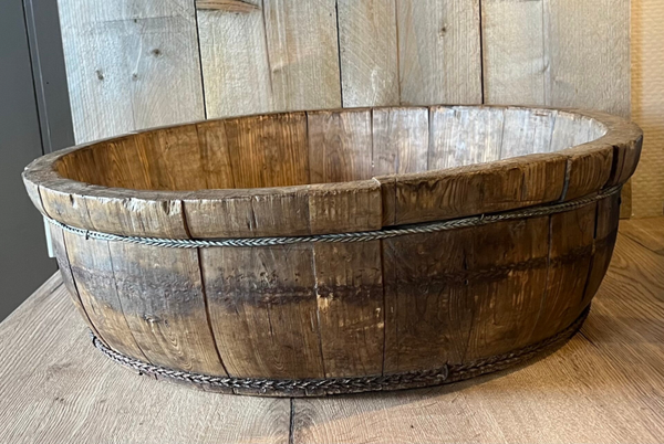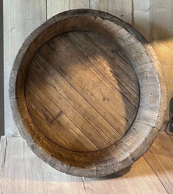 Oude houten olijfbak diameter 60 cm hoogte 19 cm